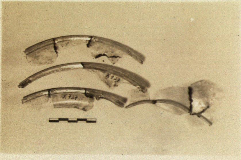 | Description: | Five non-joining pieces from base and rim of wide bowl. Low base ring, depression in bottom giving a bump on floor. Horizontal rim with thickened lip. Very thin light bluish green glass. | |