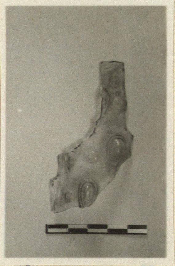 | Description: | No edges preserved. The glass was blown into a mold which left on the outside a raised ornament of large drops alternating with smaller round projections. From an almond bassed beaker. Thin fabric of pale yellowish-green glass. | |
