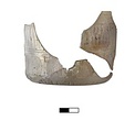| Description: | About half the bottom, and part of the wall preserved, with a non-joining rim and wall fragment. Round moulded bowl with flat bottom, vertical side walls, and plain rim. Gouged decoration. Translucent white glass now slightly iridescent. | |