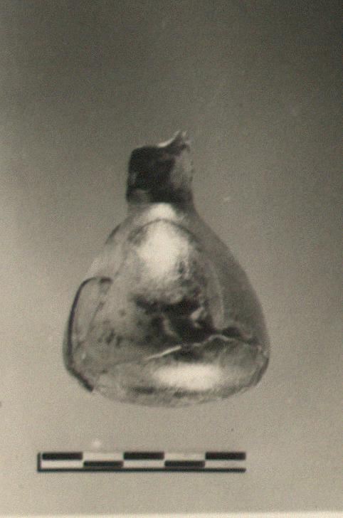 | Description: | Mended from several pieces; mouth and part of neck missing, and small pieces from wall. Pear-shaped bottle. Flat bottom; straight narrow neck. Light greenish-blue glass. | |