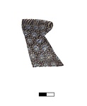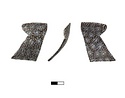 | Description: | Joins G 258. No profile preserved. Stuck all through with white bits (sea-shell ?) and blue rosettes with yellow centers. Brownish-greenish glass, thin fabric. | |