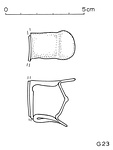 | Description: | Handle. Mended from two pieces. Small vertical handle with thumb and finger rests. Much oxidized. | |