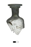 | Description: | Neck, lip and part of shoulder preserved. Band handle, from below lip to shoulder, missing. Round mouth with rounded flaring lip, set off by a ridge below. Narrow neck; short shoulder, rounding to nearly vertical side wall. The glass nearly colorless; heavily oxidized. | |
