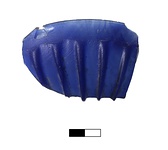 | Description: | Only a fragment from the rim and side wall remain. The outside of the moulded wall is heavily ribbed up to a plain band which encircles the top. Deep blue glass. | |