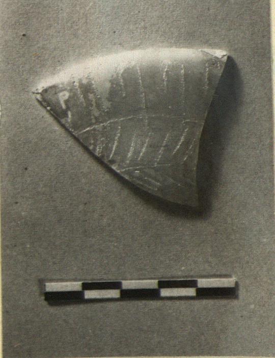 | Description: | A nearly flat fragment, turning down along the curved (broken) edge. Decorated by light incision: along the edge, alternating long and short lines; further in a branch of herringbone pattern. Nearly colorless glass. | |