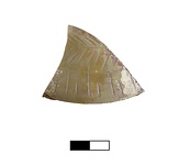 | Description: | A nearly flat fragment, turning down along the curved (broken) edge. Decorated by light incision: along the edge, alternating long and short lines; further in a branch of herringbone pattern. Nearly colorless glass. | |