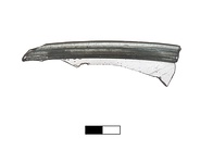 | Description: | Fragment a): from vertical rim with ridges inside and out. Fragment b): from flat bottom curving without break into side wall. Pontil. Bubbles and spirals. Rim polished after folding. Light blue glass; enamel weathering. | |