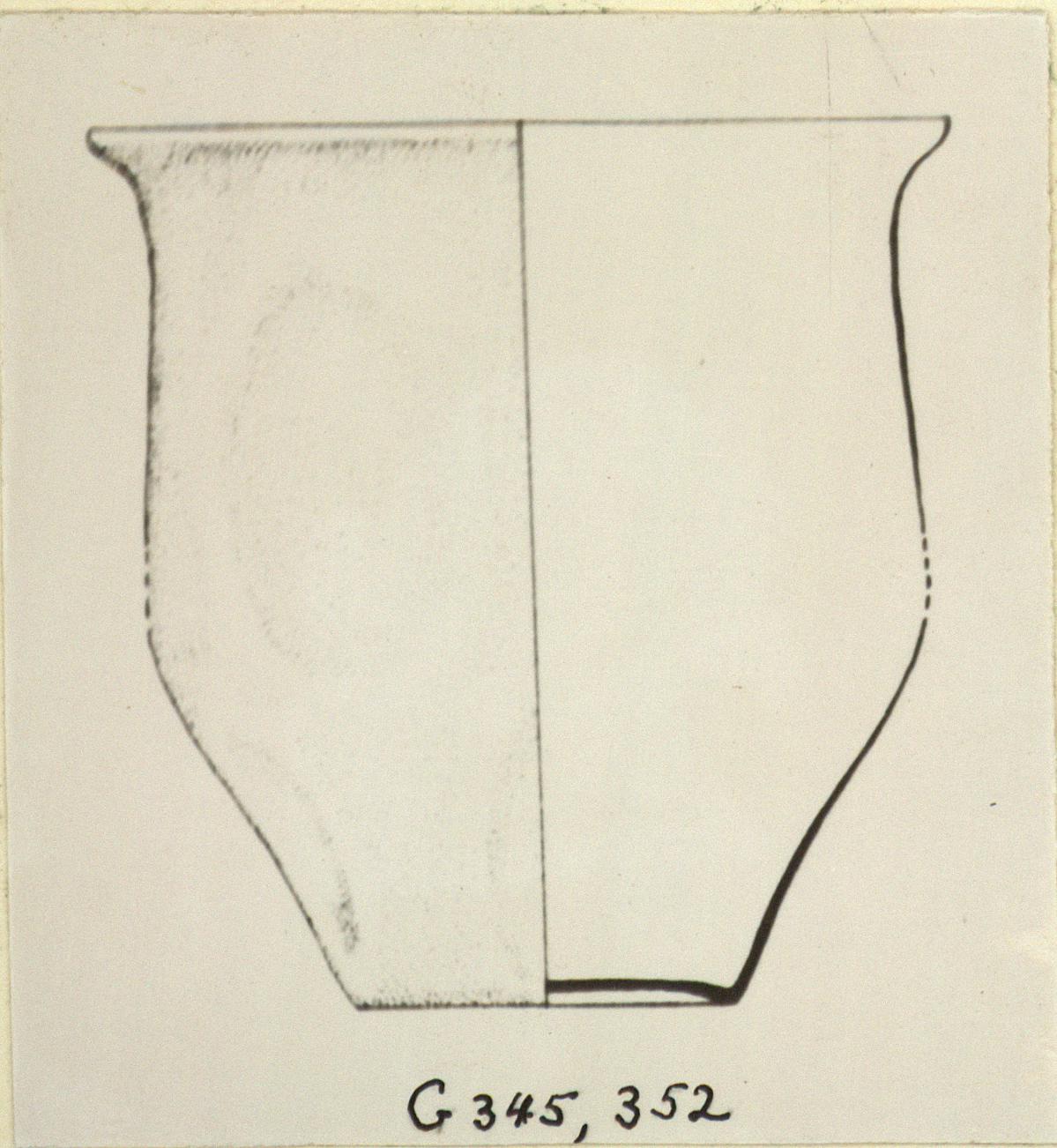 | Description: | One piece preserves lower part of cup, like G 344, but with larger indents. Traces of a second row of indents above the first. Good material; pin prick bubbles. Enamel weathering with signs of burning. The rim of this probably G 352. | |