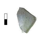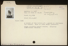 | Description: | A corner of the bottom of a square or rectangular vessel. Some of side walls preserved. Glass thickens toward center. Slightly iridescent beneath. | |