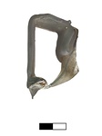 | Description: | Handle and attached section of neck preserved. Straight neck, flat wide ribbon-like handle attached at shoulder and neck below lip. Pale greenish glass. | |