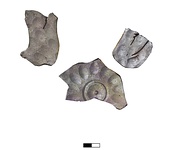 | Description: | Three fragments of a dish with a flat base and apparently a widely flaring rippled rim. Edge not preserve. Cut pattern on outside: rows of ovals. | |