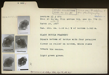 | Description: | Square bottom preserved. Four petalled flower in relief on bottom, which rises toward the center. Light green glass. | |