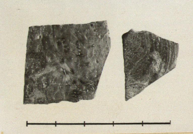 | Description: | Two joining fragments of flat piece from floor of plate. Dark green glass with marbled pattern. | |