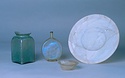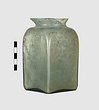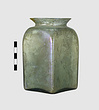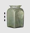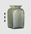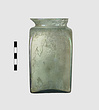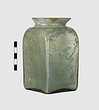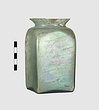 | Description: | Rim chipped, otherwise complete. Body square. Round mouth with flaring rim opens directly out of body. Light bluish green glass. | |