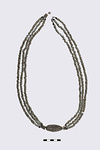 Surface crumbly. Pierced lengthwise. At one end, a ring of white leading into seven columns of scallops. Porous white decoration.