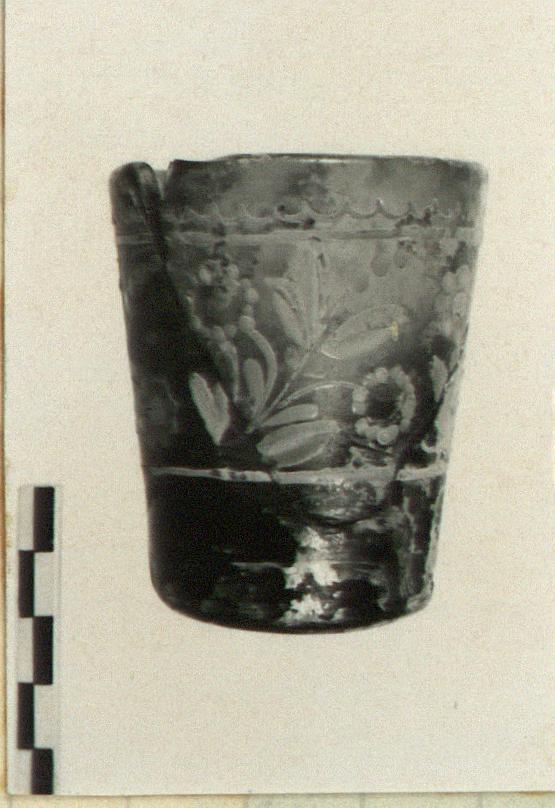 | Description: | Mended from three pieces. About one-third of rim and body missing. Heavy straight walled. Side has from top: wavy white line; straight white line; band of painted floral design in white, yellow, brown, blue; straight white line. Blue-green glass. | |