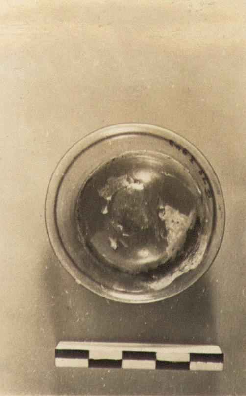 | Description: | Base of a small vase. Medium high and flaring; concave inside the foot-ring. Iridescent pale greenish thin glass. | |