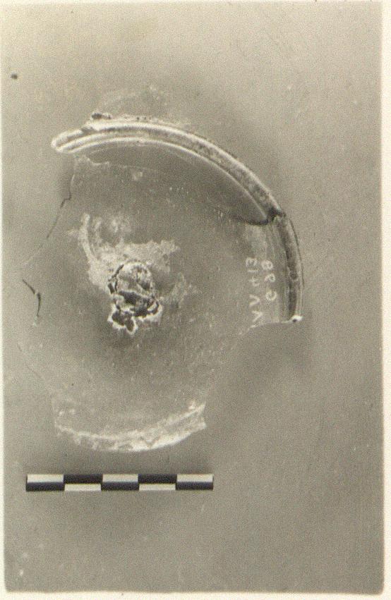 | Description: | Part of the base of a dish on a low ring foot; apparently very open. The center rises to a depression underneath which is rough. Bluish green glass. | |