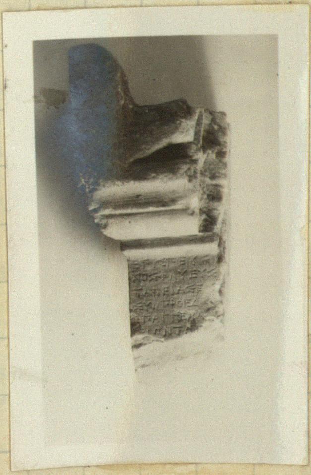 | Description: | Fragment from inscribed stele. Upper left corner, including part of pedimental top, preserved. Side worked with tooth chisel. Back rough picked. Part of six lines of the inscription preserved. Hymettian marble. Cf. Hesperia 16 (1947), p. 188, no. 94. | |