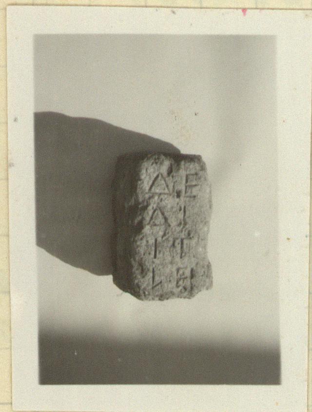 | Description: | Inscribed fragment. Broken on all sides. Boundary stone of Pedieis. Four lines of the inscription preserved, with two letters in each. Poros. | |