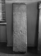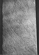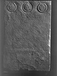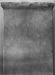 Complete; at top flat with simple crowning moulding; narrow thin tongue projects at bottom for setting up. Once almost completely covered with inscription, now much waterworn. Two-thirds of the way down are three small wreaths with radiating leaves and traces of names within.