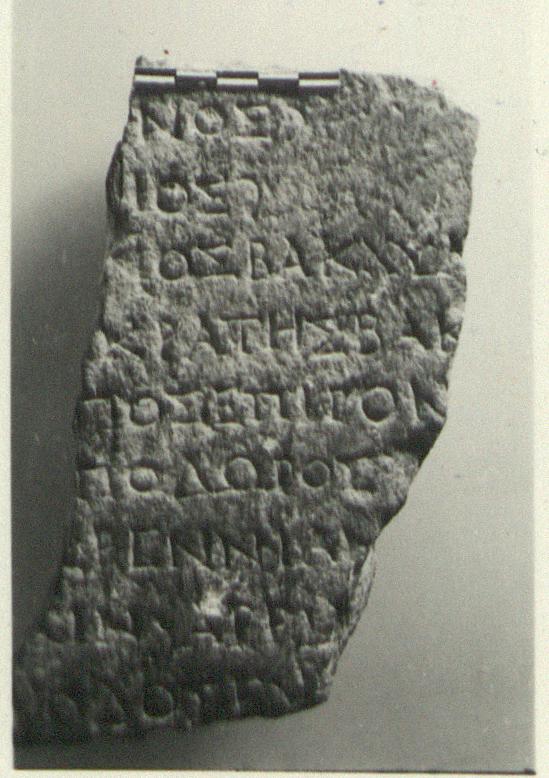 | Description: | Fragments from a relief plaque reused for an inscription. Fragments Κ 480a (a) and Κ 480b (b), broken at top, bottom, and sides. The second is stained black from the cesspool beneath which it was found. On the back of each is part of a human leg in relief. On the front, part of an inscription. On fragment a), two lines of the inscription preserved. On fragment b), nine lines of the inscription preserved. Fragment Θ 1780 (c), broken on top, bottom and sides. Joins to fragment b). Of the relief, the foot is preserved, with eight lines of the inscription below; on the other face seventeen lines of the inscription preserved. Parian marble. ADDENDA Belongs with I 4218. | |