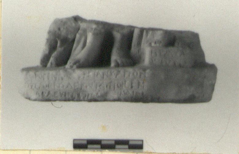 | Description: | Fragment from lower part of statuette. Broken away above. Preserved are the feet and drapery of a standing figure, on a plinth. To the right, on a small base, the feet of another smaller figure. Dedication to Athena. Inscribed on this base. On the plinth, a three line inscription. White marble. | |