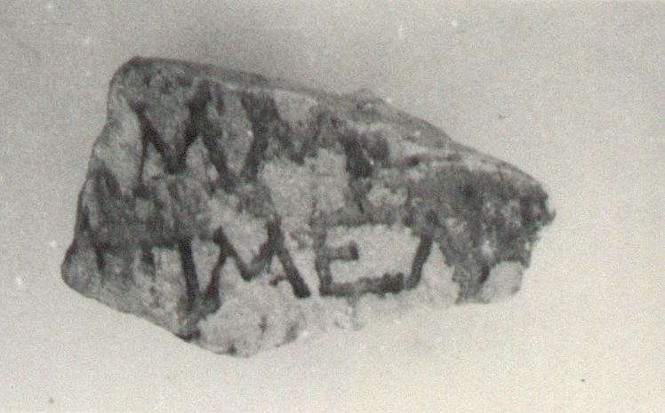 Only one surface present, on which is inscribed in curiously pitted letters.