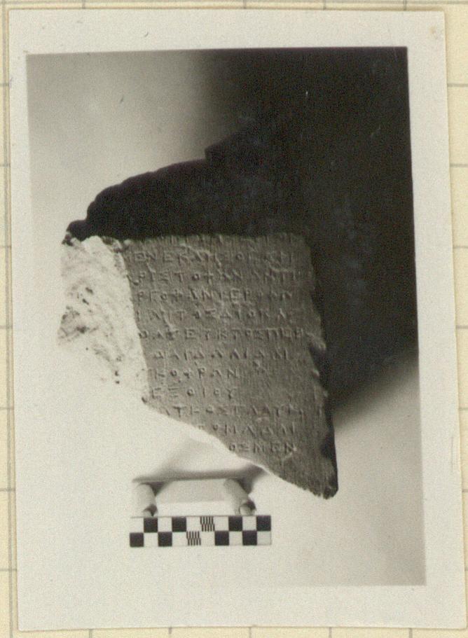 | Description: | Inscribed fragment. Toothed right side and rough picked back preserved; otherwise broken. Twelve lines of the inscription preserved. Hymettian marble. ADDENDA Joins with I 1870 (B 664). Cf. Hesperia 23 (1954), p. 302, no. 40. | |