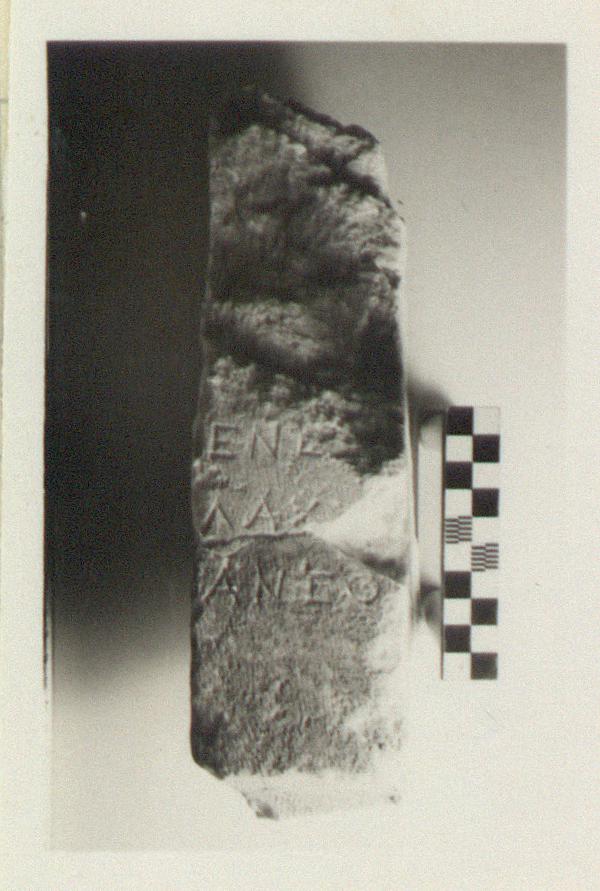 | Description: | Inscribed fragment. Left side, toothed, then smoothed picked, preserved; otherwise broken. Near the bottom the stone narrows sharply both on front and side, in concave, toothed surfaces. Two fragments and a sliver all joining. Three lines of the inscription preserved. Hymettian marble. | |