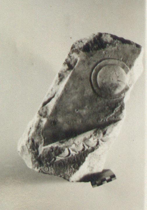 Dish ornament in pediment. Egg and dart moulding between pediment and inscribed part of stele.