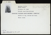 | Description: | Inscribed columnar grave monument. Broken at top, bottom and back. Three lines of the inscription preserved. Hymettian marble. | |