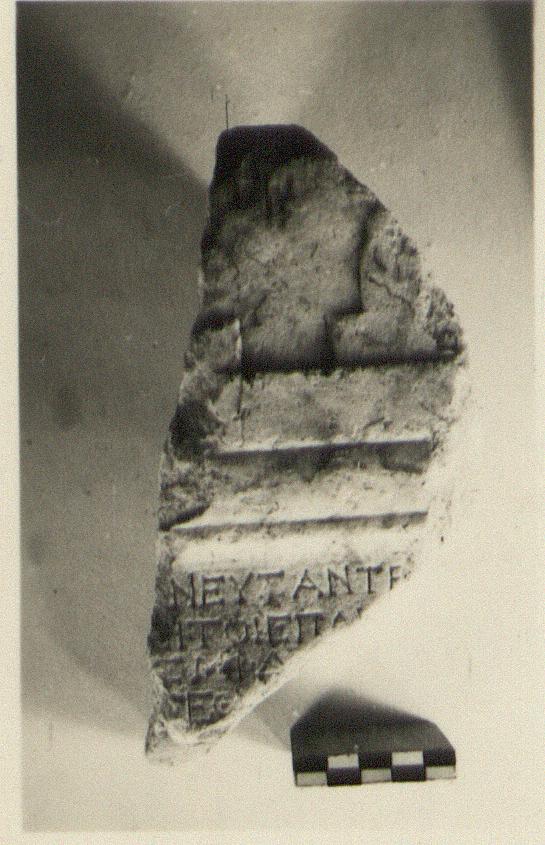 | Description: | Inscribed fragment. Rough picked back preserved; otherwise broken. At top flat moulding and low relief. At least twenty four letters remain in part. Pentelic marble. | |