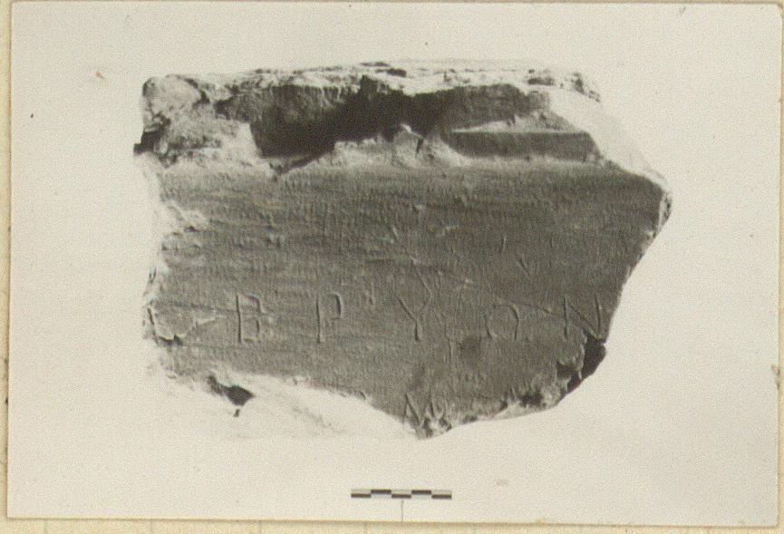 | Description: | Inscribed fragment of base; grave stele (?). Left side and face preserved. Inscription below moulding. Five letters remain. Hymettian marble. | |