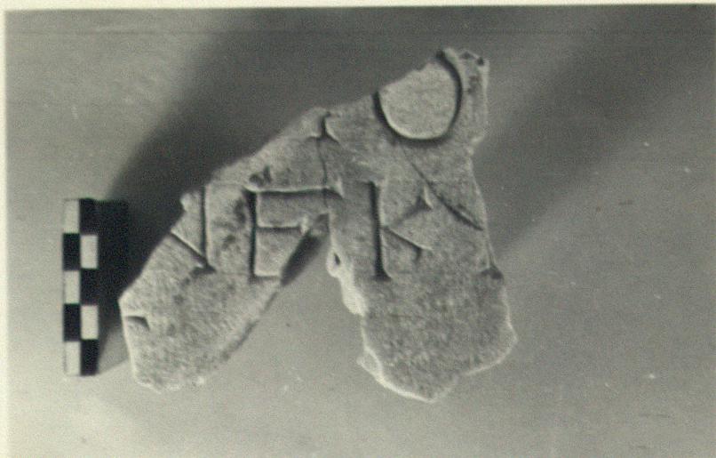Dimensions:   H. a) 0.07, b) 0.095, c) 0.082; Lett. H. 0.027, (of fragment b and c, as joined) 0.05; W. a) 0.053, b) 0.047, c) 0.06; Th. a) 0.053, b) 0.015, c) 0.054