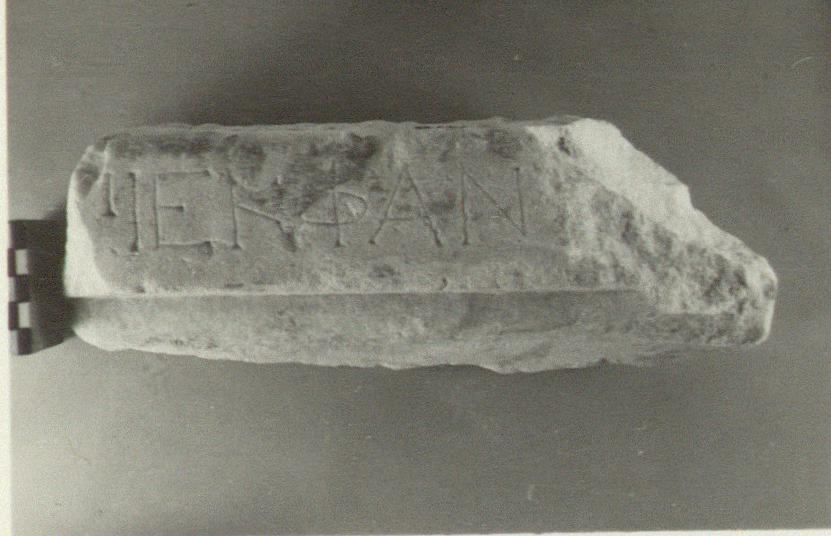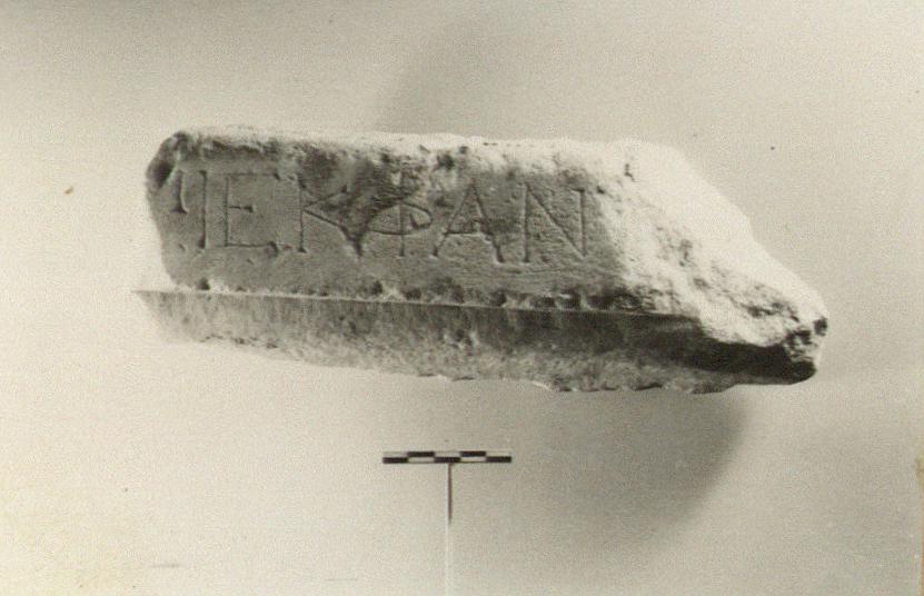 | Description: | Inscribed fragment of dedicatory monument. Part of top of small dedicatory monument with receding moulding below inscribed fascia. Broken at sides and back and bottom. Seven letters remain. Pentelic marble. | |