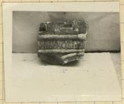 | Description: | Fragment from top of inscribed monument. Broken at both ends and at bottom. The back, with small pick-marks, curves, at the top toward the front. In front at the top, some sort of ornamental device has been partially 0.054m. wide, carrying the letters. Below this a second moulding. Below again, and at the right, appears part of a niche, bordered by a moulding with angular profile like the other two. Pentelic marble. | |