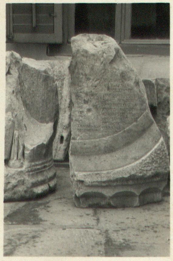 A column drum, with flutings begun at the bottom, on which the shield, with prytany list, was carved. Bottom and front surfaces only preserved; broken at sides, back and top.