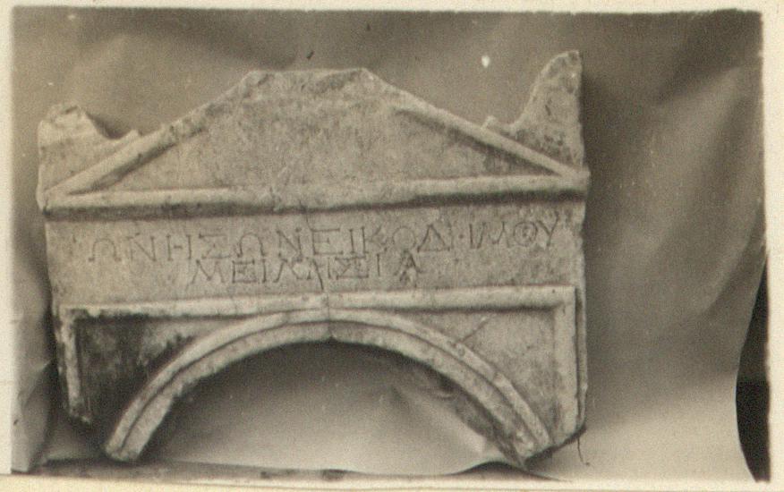 | Description: | Upper part of grave stele with inscription. A grave stele with pediment top; broken at bottom. Inscription of two lines, and arch over niche for relief, preserved. Pentelic marble. | |
