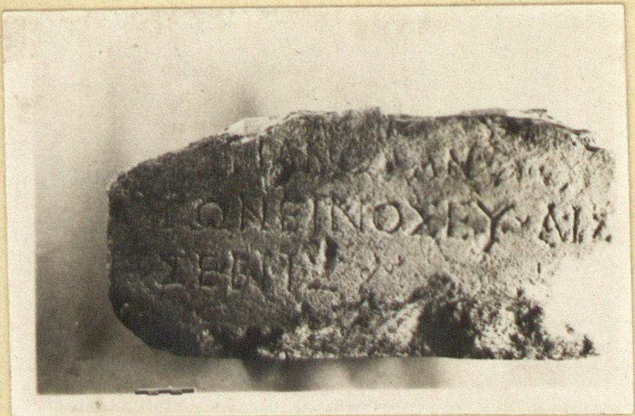| Description: | Fragment of inscribed base. Inscribed face, rough picked left face, and bottom preserved. Three lines of the inscription preserved. Island marble. | |