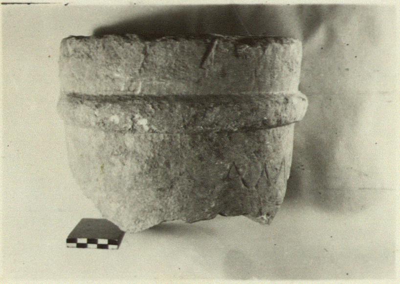 | Description: | Inscribed fragment of columnar grave monument. Original top and about half of the circumference of column preserved. Broken at bottom. Six letters remain. Hymettian marble. | |