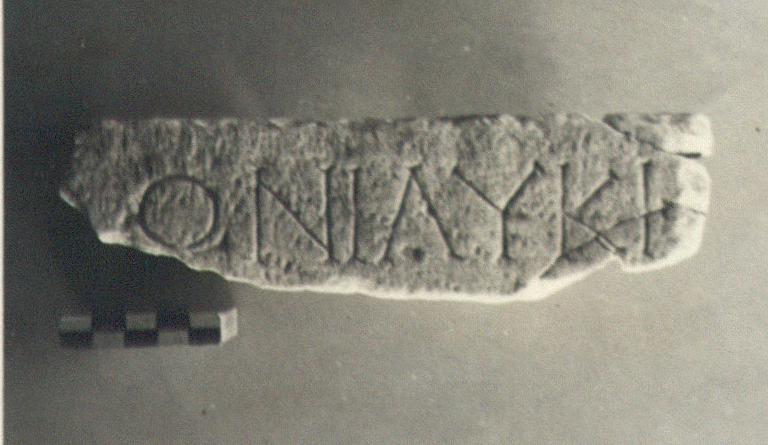 | Description: | Inscribed fragment. Part of top preserved. Dedication to Apollo. Seven letters remain. Pentelic marble. | |