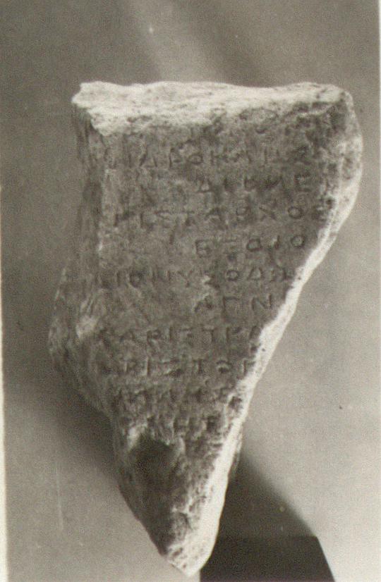 | Description: | Inscribed fragment. Inscribed face, and rough picked back preserved. Surface much worn; slightly raised below the inscribed surface. Prytaneis of the tribe Demetrias. Ten lines of the inscription preserved. Pentelic marble. | |