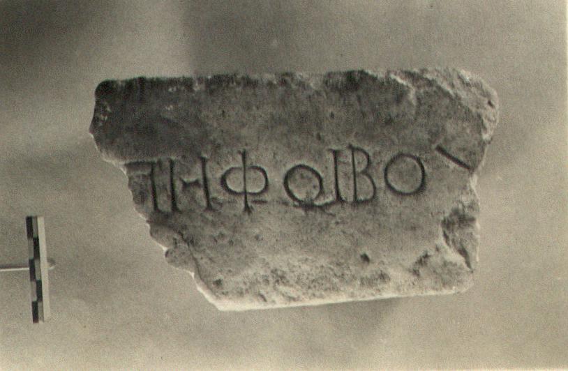 | Description: | Inscribed fragment of base (?). Bottom, dressed smooth, and top, somewhat rougher, preserved. One line of the inscription preserved. Pentelic marble. | |