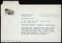 | Description: | Inscribed fragment. Inscribed face, right side, and rough picked back preserved. Fragment from upper right corner of pedimental stele. In field, head of a woman (?) facing, bent to left, in high relief; much battered. Inscription on "architrave" above: seven letters. Pentelic marble. | |
