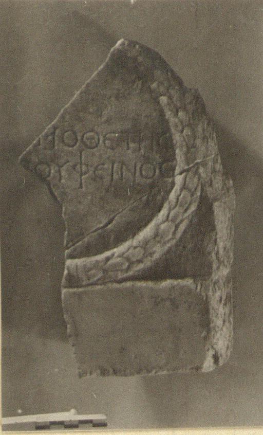 | Description: | Inscribed fragment. Inscribed face, rough picked back, and probably part of upper right side preserved. Apparently from a plaque circular at the top. Wreath in high relief. Two lines of the inscription preserved. White marble. | |