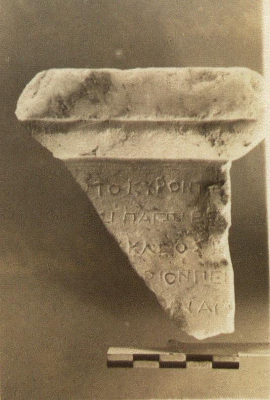 | Description: | Inscribed fragment. Upper right corner of a small stele with ovolo and fascia above. Five lines of the inscription preserved. Pentelic marble. | |