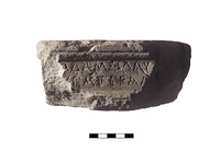 | Description: | Inscribed fragment of grave monument (?). Inscribed face, top, bottom and left side preserved; top worn smooth. Mouldings top and bottom of face and side. Part of a circular cutting in top. Two lines of the inscription preserved, between guide lines. Hymettian marble. | |