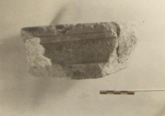 | Description: | Inscribed fragment of grave monument (?). Inscribed face, top, bottom and left side preserved; top worn smooth. Mouldings top and bottom of face and side. Part of a circular cutting in top. Two lines of the inscription preserved, between guide lines. Hymettian marble. | |