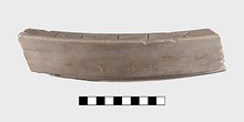 | Description: | Inscribed fragment. A scrap from the side wall of a shallow basin with slightly offset collar around the top outside. The floor is lightly stippled and considerably worn. Inscribed on the upper face of the lip. A fine grained white marble with dark streaks. ADDENDA A fragment of another similar basin, uninscribed is ST 80 (B 729); on shelf with well group B:15/ΛΔ. | |